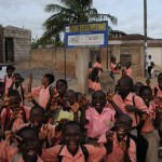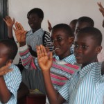Our first stop was a series of four schools. We drove west toward Cape Coast, leaving the intensely crowded city of Accra behind. Soon, we were passing banana trees, small villages, and roadside stores. Ghana is a beautiful country, but the intense humid heat makes me melt. I have to carry a bandana to continuously wipe the sweat covering my face. We go through drinking water faster than we can find stores to buy it. We have been keeping a careful eye on Paul, who sometimes forgets to keep drinking. With his shaggy mop top, he is especially hot. After 2.5 hrs we reach our destination.