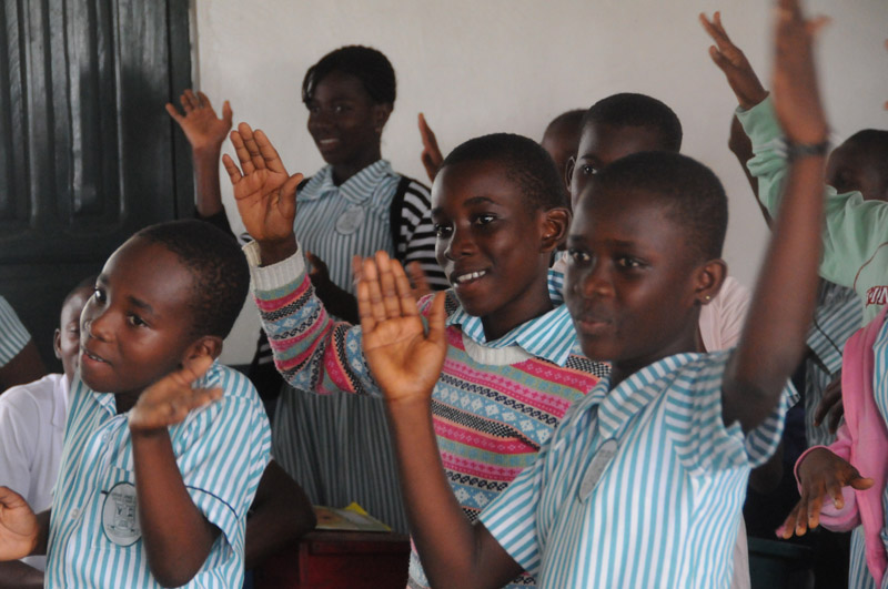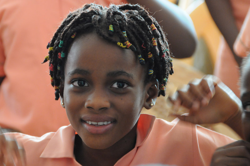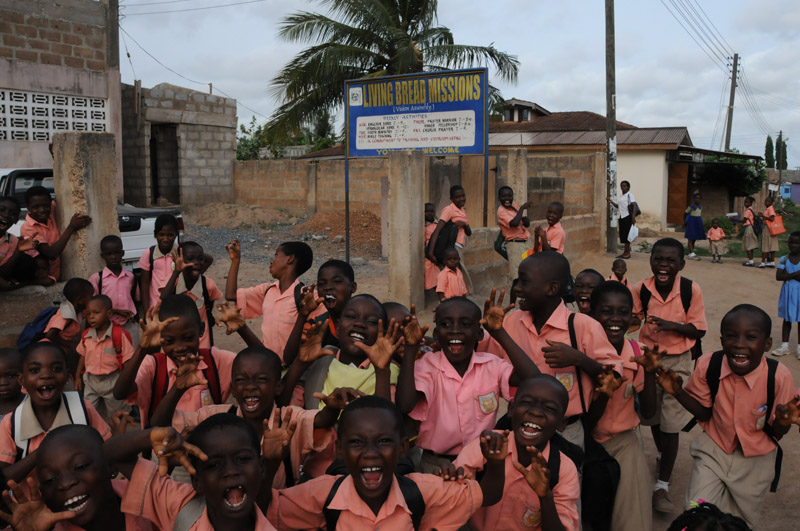 Our first stop was a series of four schools. We drove west toward Cape Coast, leaving the intensely crowded city of Accra behind. Soon, we were passing banana trees, small villages, and roadside stores. Ghana is a beautiful country, but the intense humid heat makes me melt. I have to carry a bandana to continuously wipe the sweat covering my face. We go through drinking water faster than we can find stores to buy it. We have been keeping a careful eye on Paul, who sometimes forgets to keep drinking. With his shaggy mop top, he is especially hot. After 2.5 hrs we reach our destination.