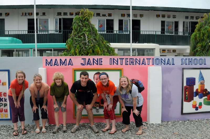 Most of the day was spent visiting the Mama Jane International School. It was “International” because it had flags painted on the buildings. The kids at the school were smart! We met Mama Jane and her husband Pastor John as we pulled into a school that is surrounded by small mud and brick shacks, tin roofs, and no running water. It was pouring rain as we drove to the school. The rain had mostly stopped by the time we arrived. Folks were using buckets to collect the brown water from their roofs.