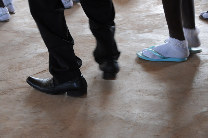 The girls wore cute little white socks with flip-flops, and the boys had black shoes. The shuffling you hear in the background is their stomp-step.