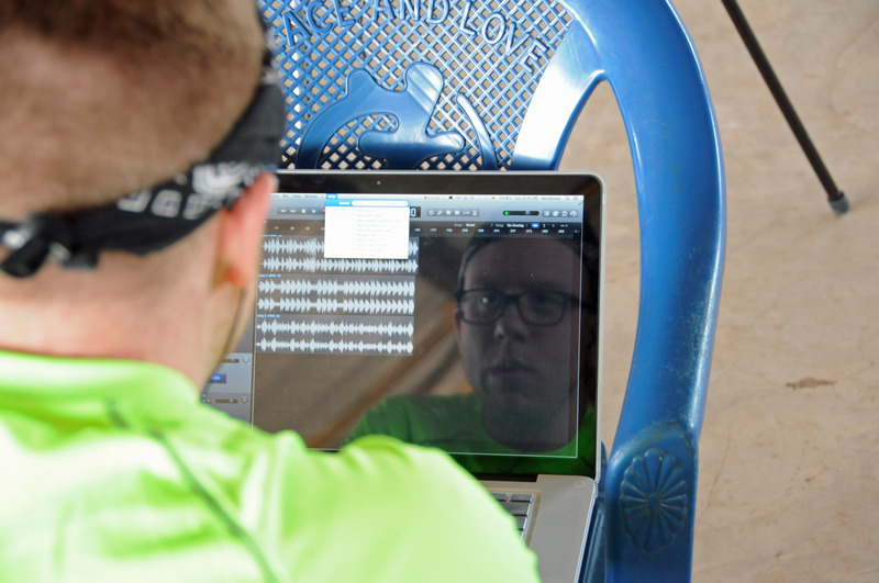 Kevin and Nathan test the room for sound dynamics and we setup the microphone on my tripod with an elastic strap. The choir is cautiously smiling, nervous, and looking at our equipment a bit of apprehension. We set the drums up outside the building, under the porch, knowing they would deafen us in the small classroom.