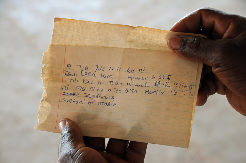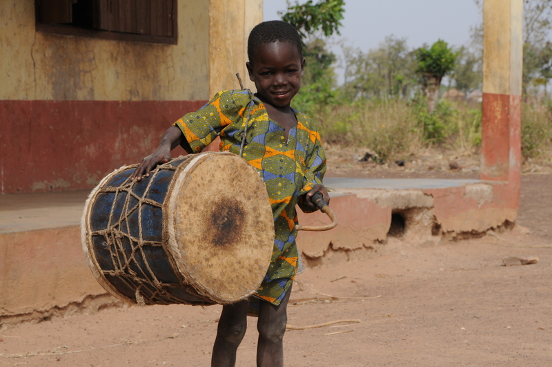 Several miles south of Zamashegu we turned West into the bush. The electrical lines follow the main roads, and within moments we entered a land where strong calloused hands build homes, plant crops, and wash clothes. Our destination was the village of Dayudigili. Larger villages have a government-built concrete school building with 4 to 5 classrooms. The building is always open. Rough-hewn wooden desks face a blackboard painted on the concrete. On Sundays, the classrooms become a church. Today, however, the rooms will be a recording studio. As we setup, curious children peek in, eyes wide.