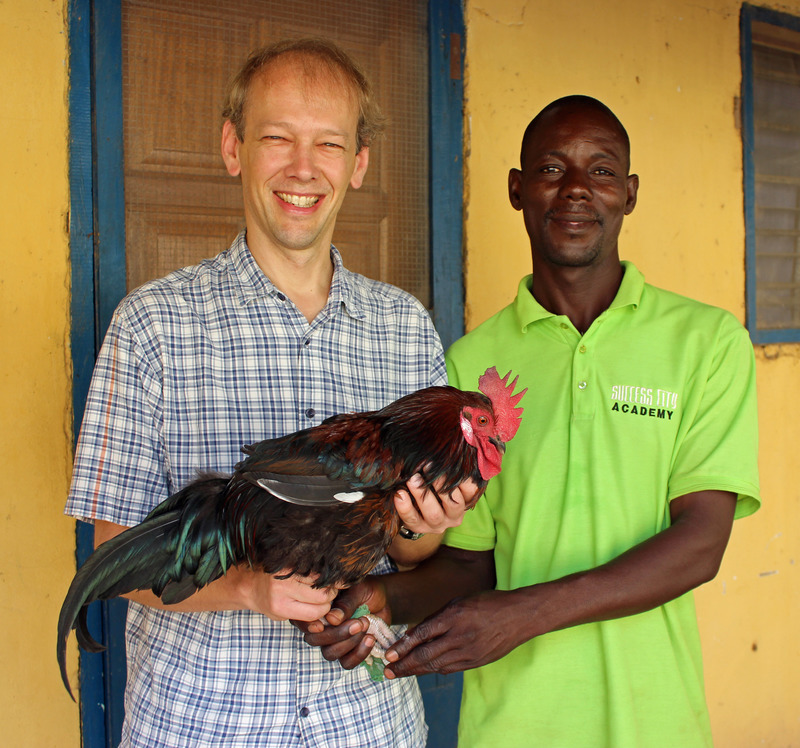 This morning, as we were packing up for our drive to Gushegu and Zamashegu, Pastor Elijah came by with a present for us. He thanked us for our work, and handed me a live rooster. His feet were tied together and I slipped one hand under his chest and with the other grabbed his legs as the rooster looked up curiously at his new pale white owner. Hmmm. I think Elijah sensed my awkwardness as he flashed the most amazing smile. After we thanked Elijah and he left, I put the rooster in one of the bedrooms, closed the door, and we finished packing up and started to load up Ray’s truck. It was then that I discovered that trying to pick up a rooster sitting on the floor of a bedroom is not for the timid. Even with his legs tied together I had to chase him around the bedroom as he flapped his wings, squawked, and pecked. The mighty African warrior prevailed, and I returned to the kitchen with my rooster in tow. “Roger” was put in a cardboard box put in the truck.