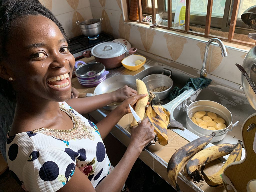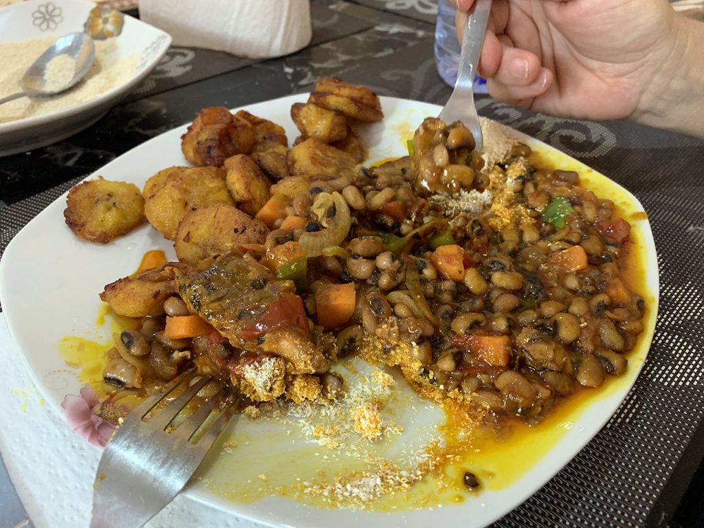 Selwyn and Richess insisted we enjoy a meal with them before driving into the remote bush, so Estella, Richess, Christian, and Enoch all helped prepare meal of Red Red (which happens to be Beth’s favorite). Red Red cannot be considered part of a healthy Mediterranean diet… but Mmmmm, it is tasty. It is made from red plantains and beans and red palm oil. A meat is usually included. The red palm oil swims atop the beans, and we sprinkle dried, powered cassava to soak it all up.