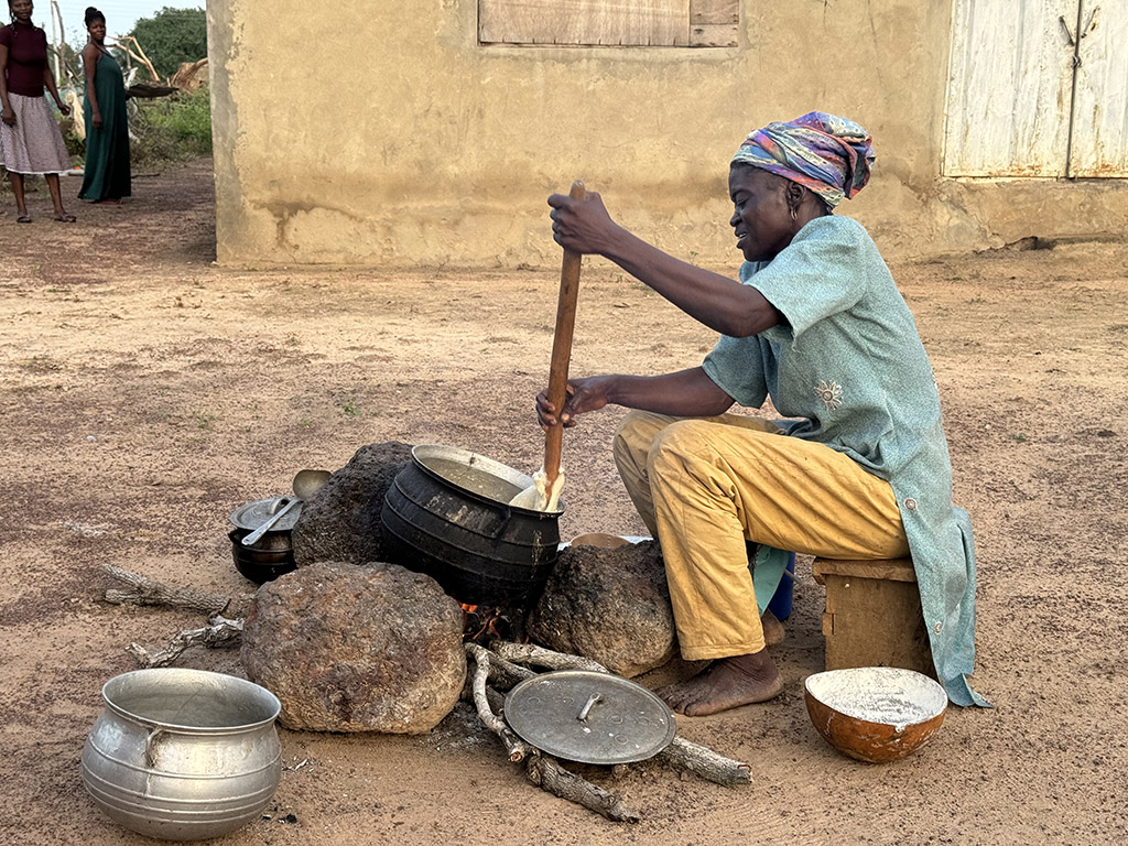 The “bore hole” here will continue to provide the village clean water for a few more months. It will fail in January. Villagers will be forced to drink dirty water carried from the livestock watering hole.Working hard making “banku”, a fermented dough of cassava and corn.The grain silo will need to store 6 months of food to supply the family through the dry season