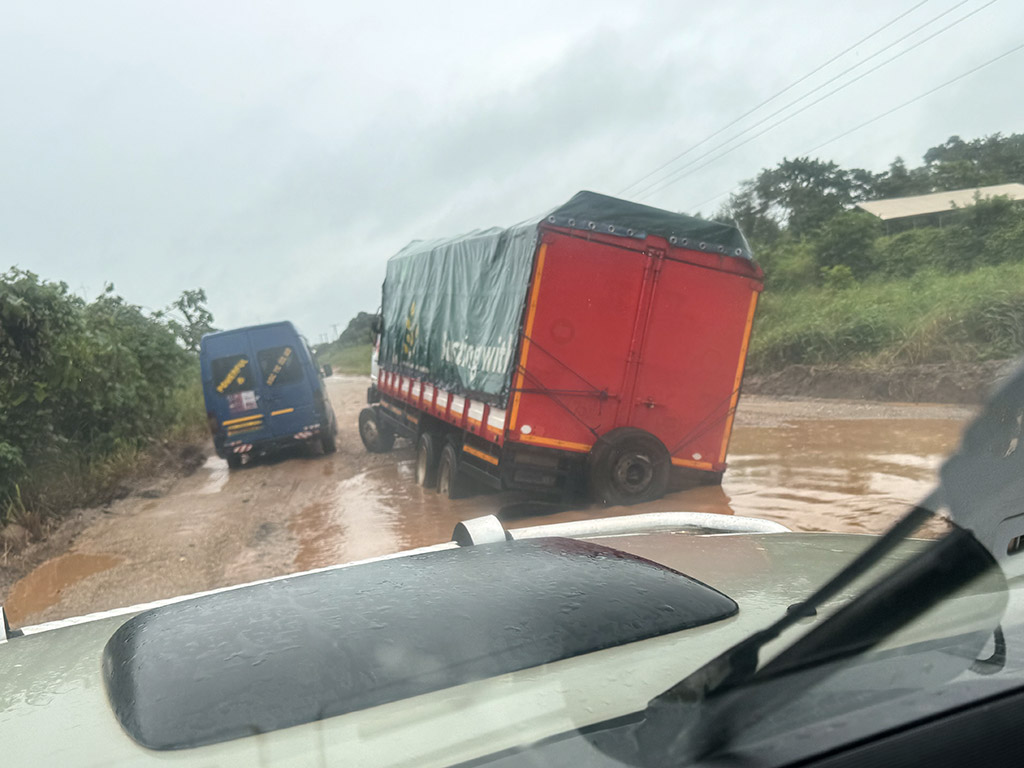 The rains have washed out bridges, and sections of pavement. All along the route we see disabled trucks and busses. Driving is an exhausting vigilance. Yet we make the best of the rough travel by listening to music, singing, and talking to Cyrus and Clement about their dreams, their work, and their hopes.