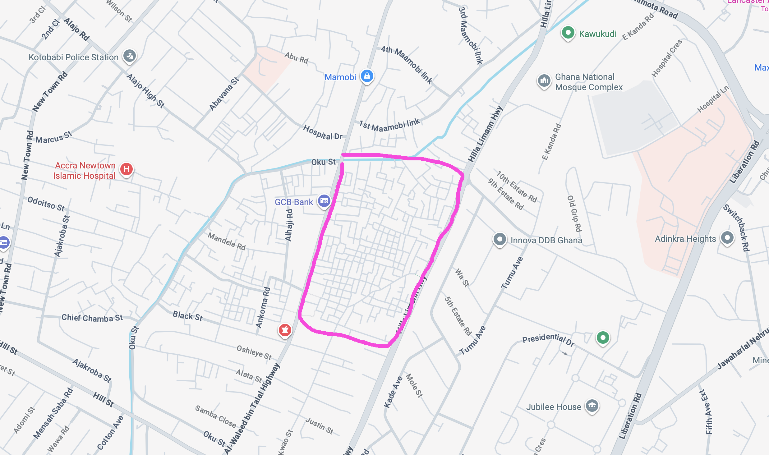 Nima Zongo is well known. Wikipedia explains the Zongo is one of the largest and oldest in Ghana. Since I was driving Ray’s new truck, a Mahindra from India, it seemed wise to do some route planning and map exploration. The map reveals the dense warren of 1-story concrete block buildings and rusty metal roofs of the Zongo. Narrow walkways zigzag between homes and stores. We parked near one of entry points.